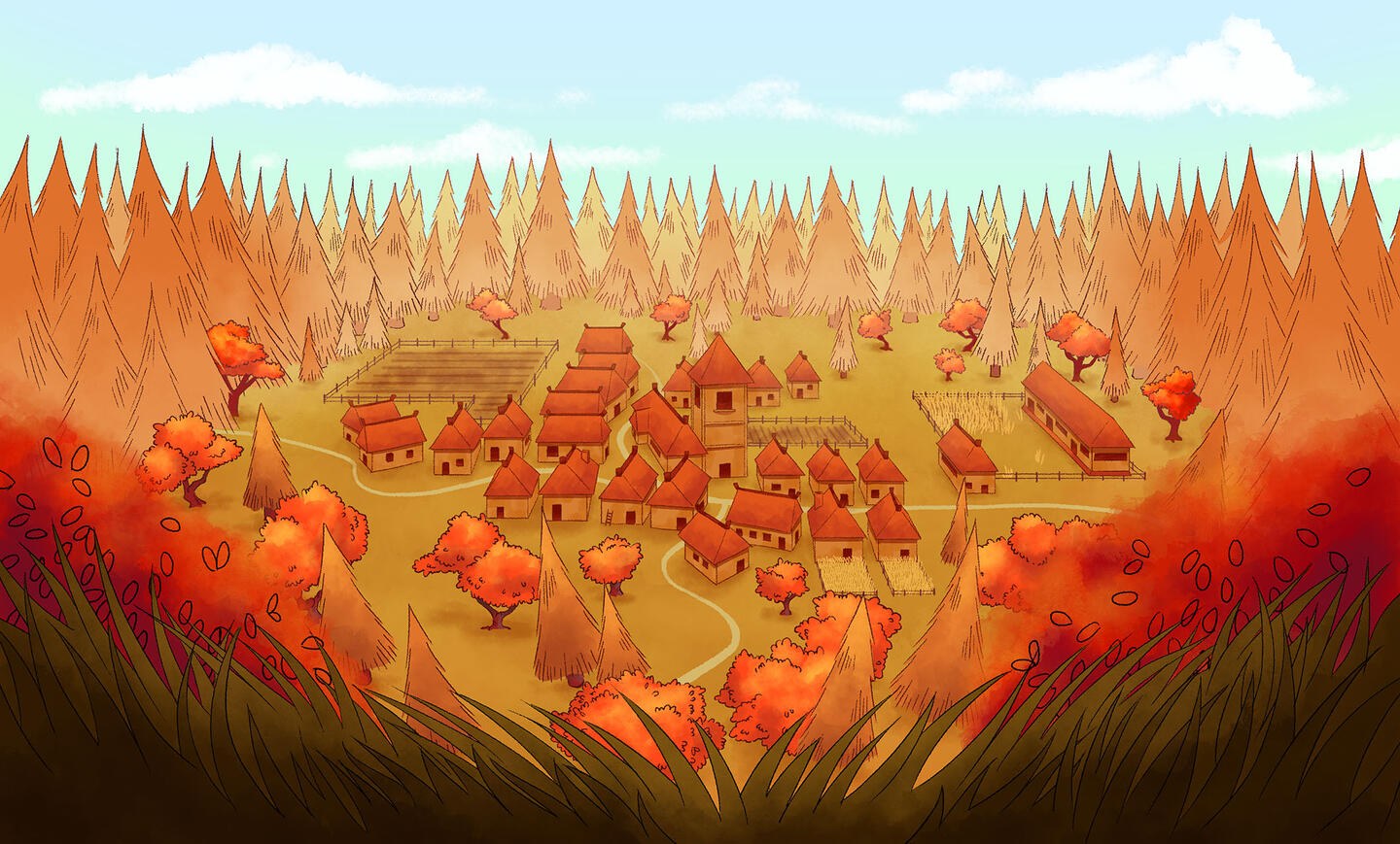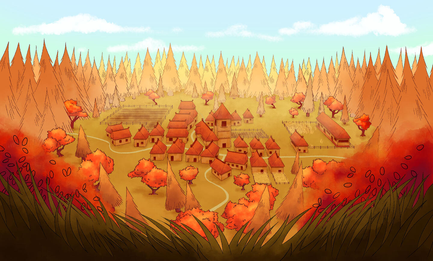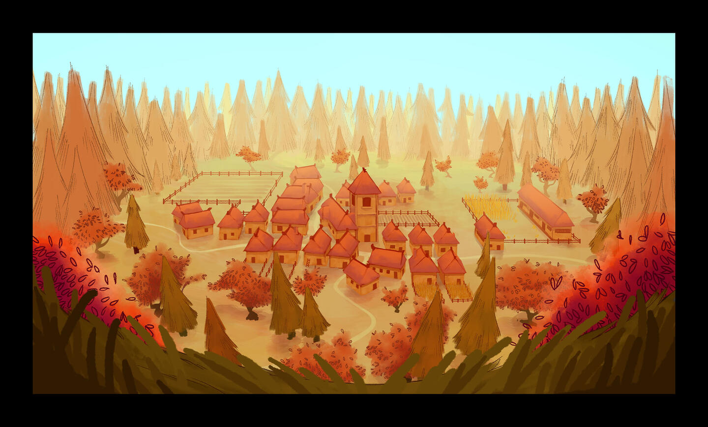 - Surrounding environment was coloured and rendered first prior to the village to give better context of the lighting. Atmospheric depth and extra value editing came in the last pass.