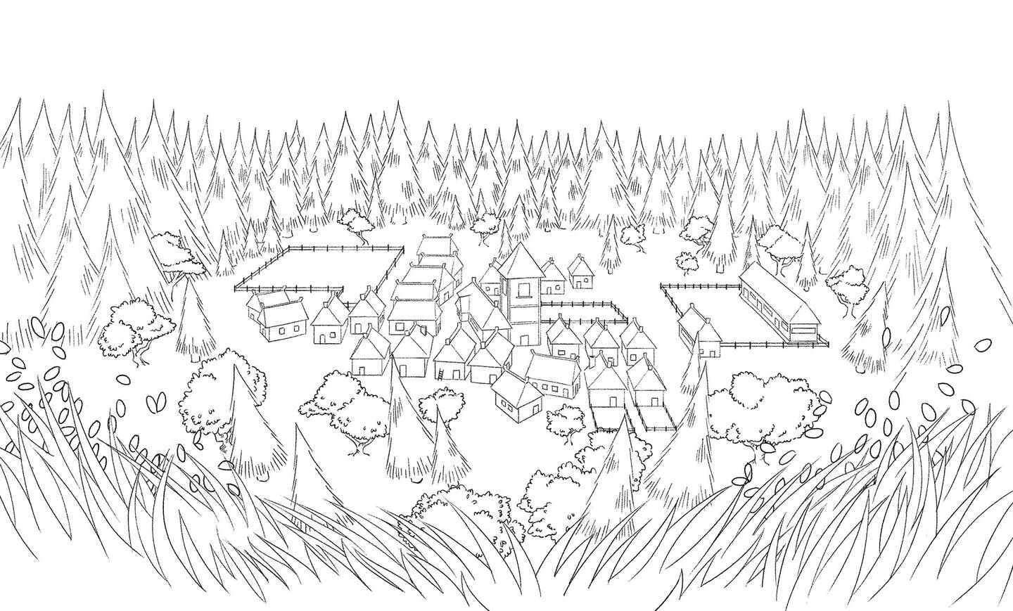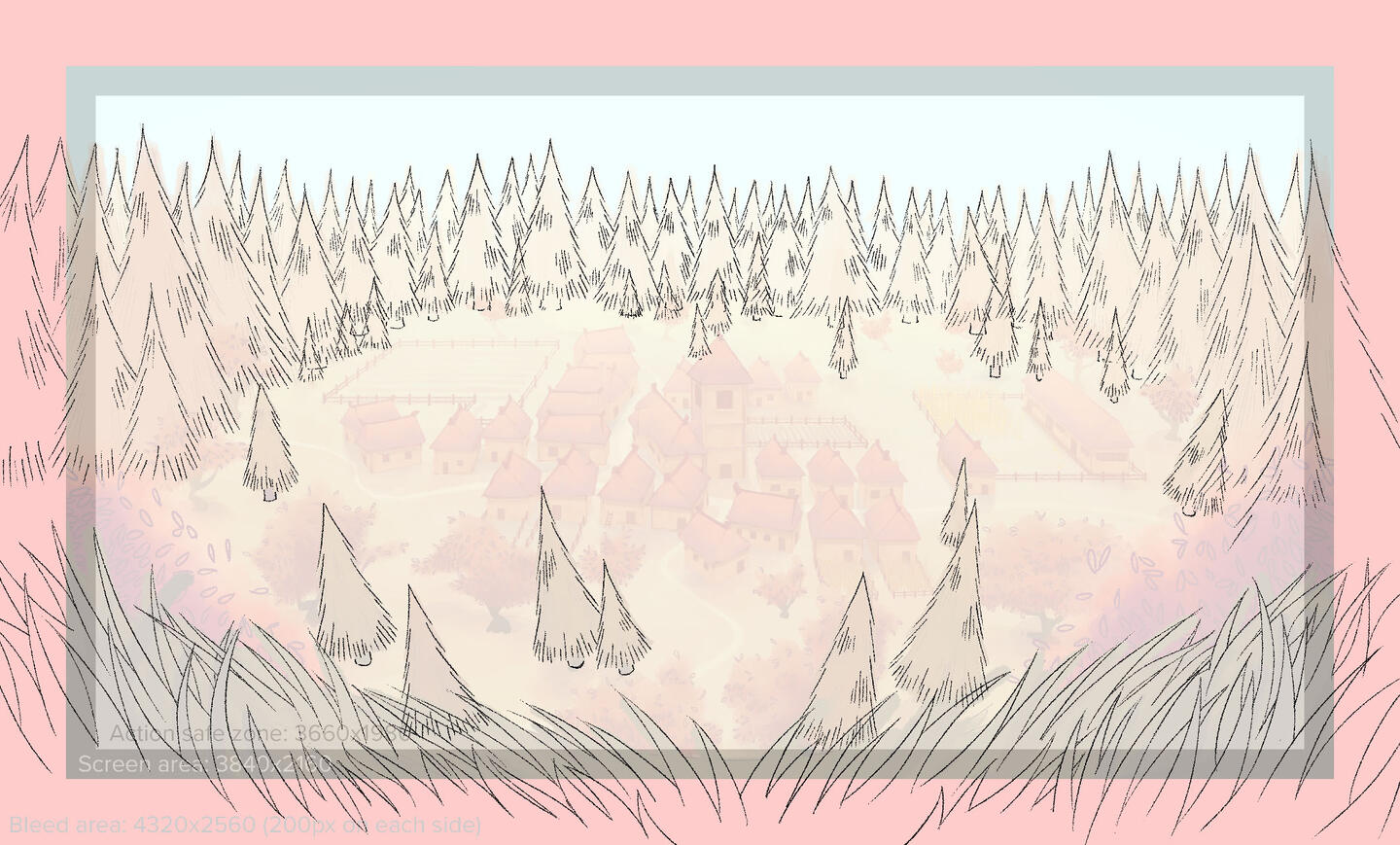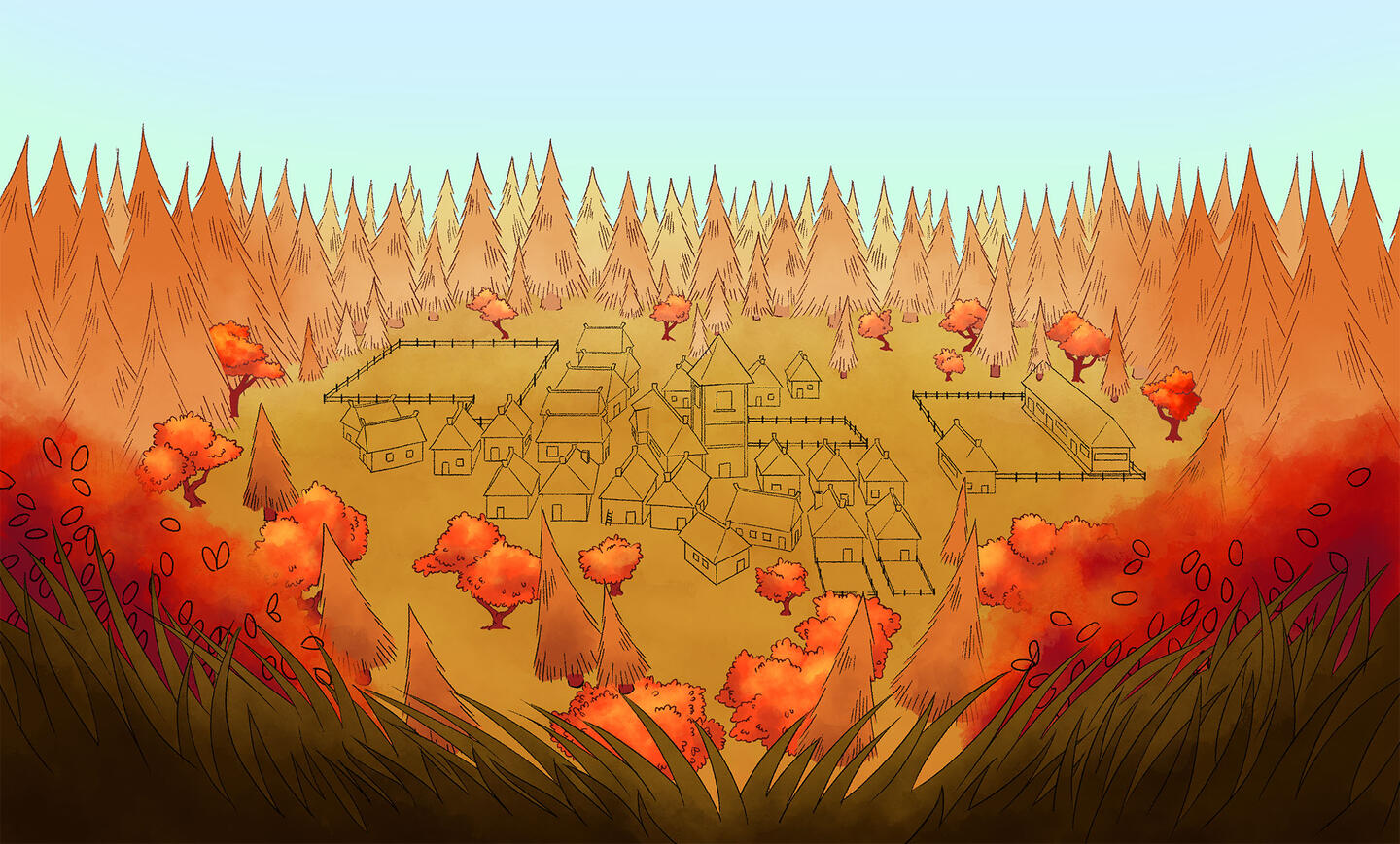 - Surrounding environment was coloured and rendered first prior to the village to give better context of the lighting. Atmospheric depth and extra value editing came in the last pass.