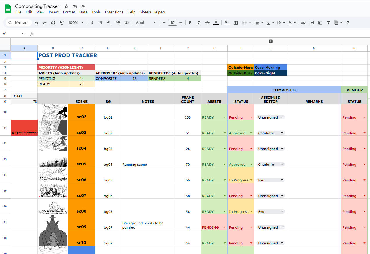 Post-production: Compositing alongside my team mate. Animation and backgrounds rendered separately then layered in post.I used Blender (Grease Pencil) and Adobe After Effects for production, Google Spreadsheets for project management.