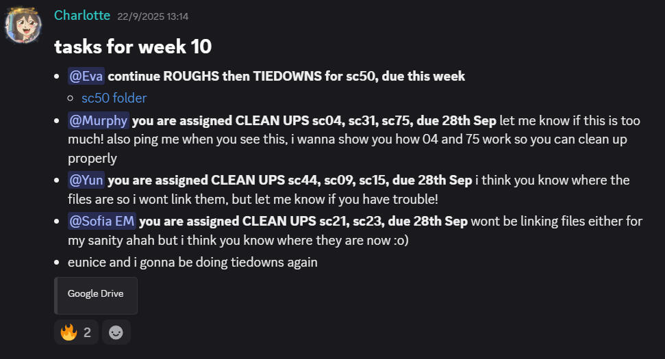 sc08 - Roughs + Tiedowns + Inbetweens (Combined steps), Clean up, Colours