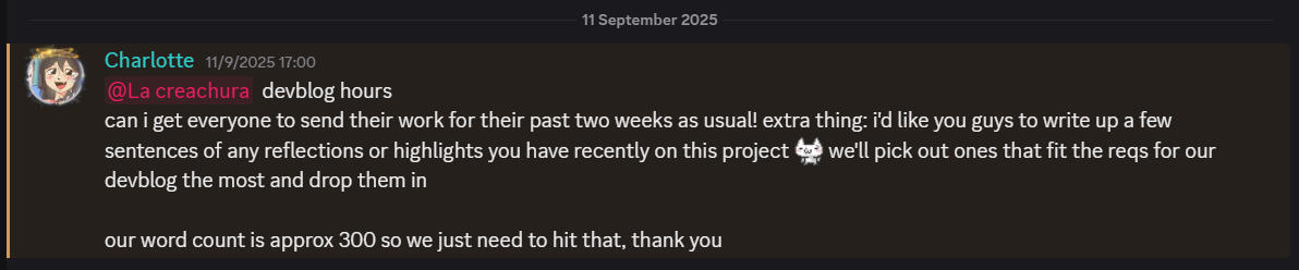 • Devblogs were mostly managed by me, this round I decided to get everyone to do reflections instead of writing long blogs which worked out better.